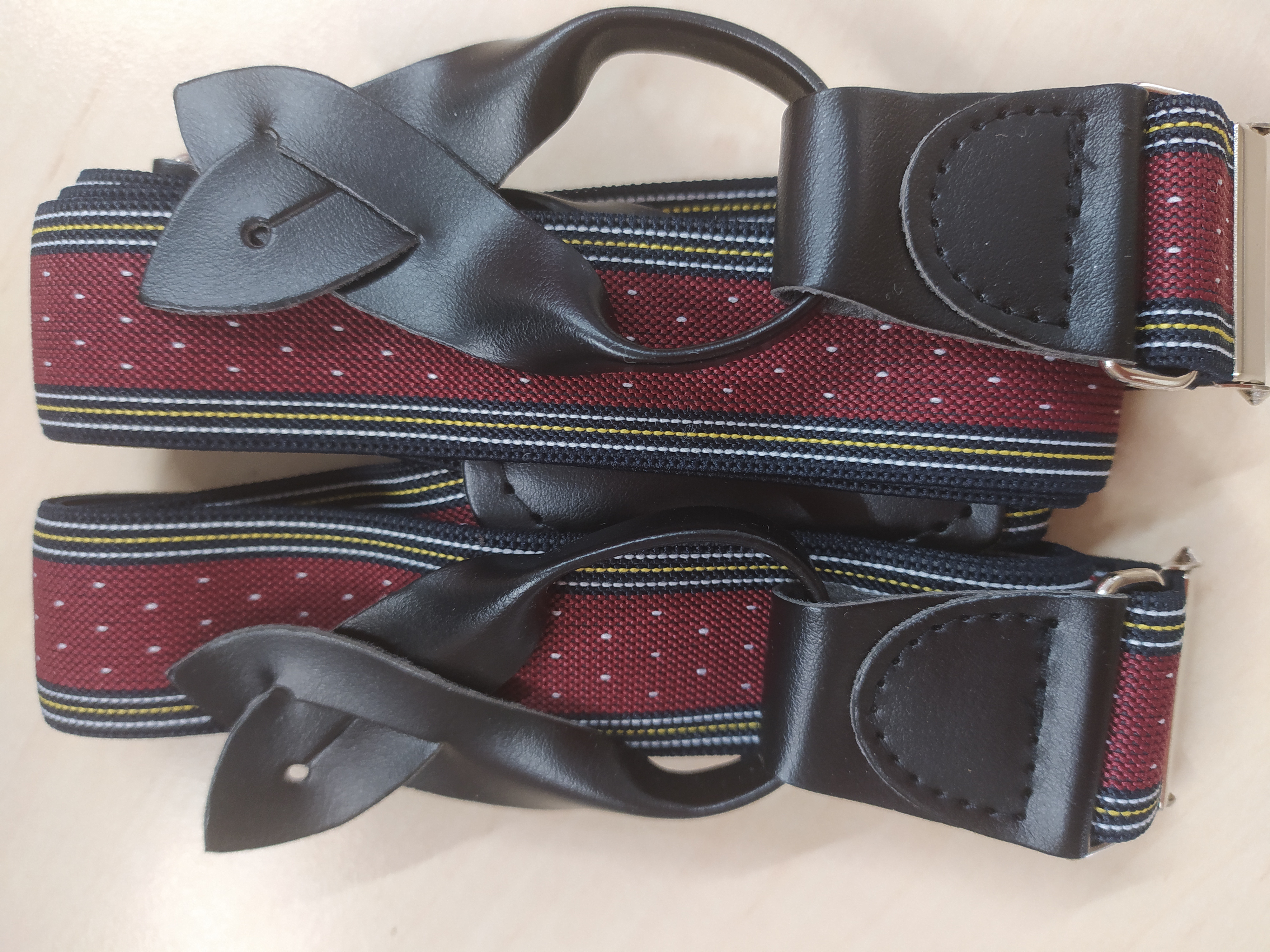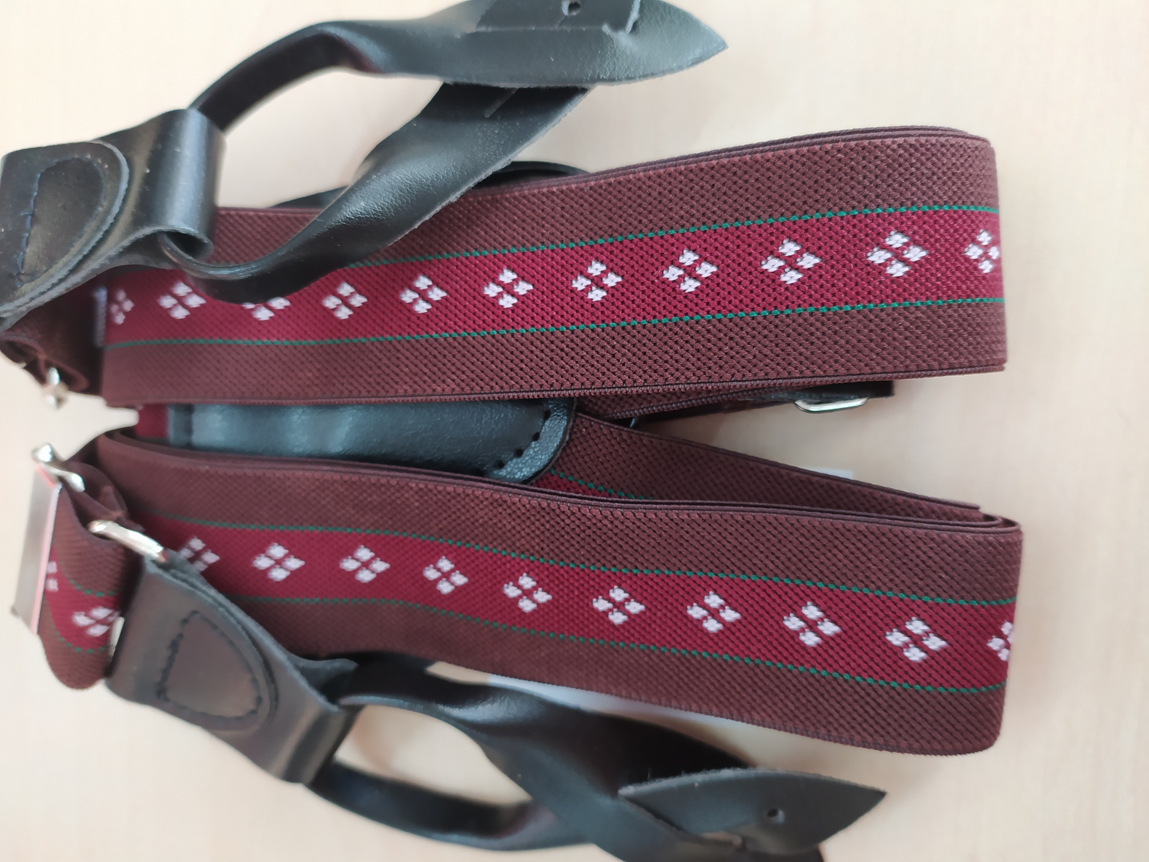 Šle pánské s koženkovými poutky, šíře 3 cm se třemi závěsy, tvar Y, na výšku postavy až 195 cm, maximální délka je 115 cm v nenapnutém stavu. Český výrobek, cena za 1 ks. Šle mohou být jednobarevné i s jemným potiskem, podklad je stejný, různé kombinace a varianty. Na kalhoty je zapotřebí našít knoflíky na které se poutka uchytí. Knoflíky nejsou součástí balení.