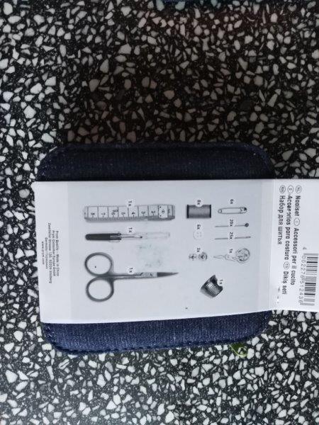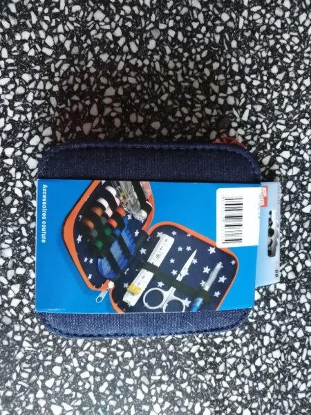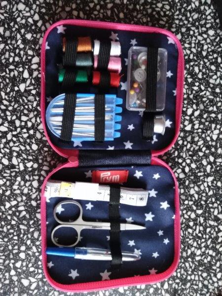 Praktické cestovní šití, rozměr 11x12x3 cm. Obsah: 1x nůžky, 1x páradlo, 1x krejč.metr, 8 barev nití, 6x knoflík, 3x patent, 1x náprstek, 1x navlékač, 25x jehla, 20x špendlík, 6x zavírací špendlík.