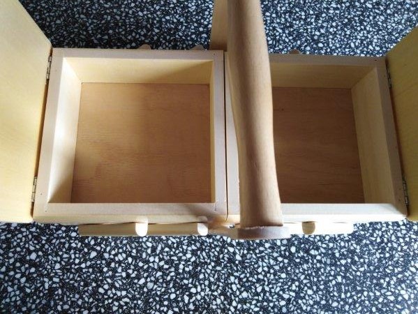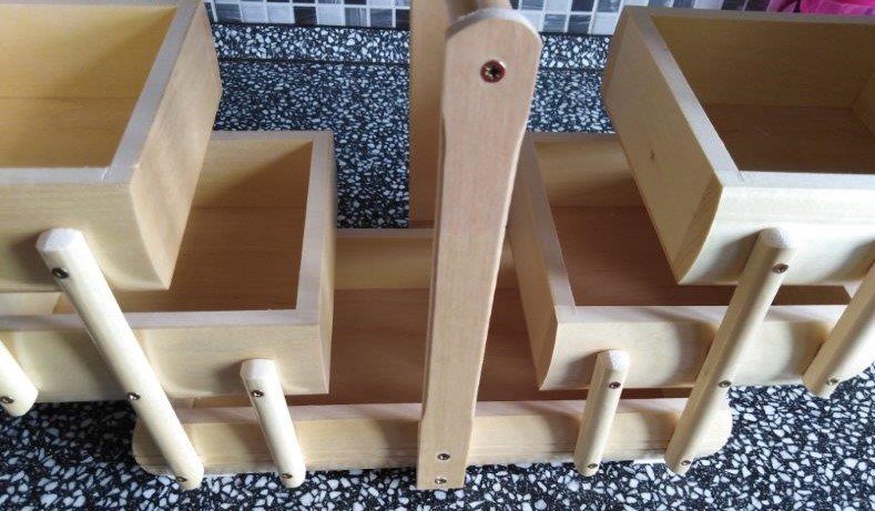 Dřevěná světlá rozkládací kazeta na šicí potřeby. Rozměry: š.34 cm, hl.18 cm, v.27 cm.