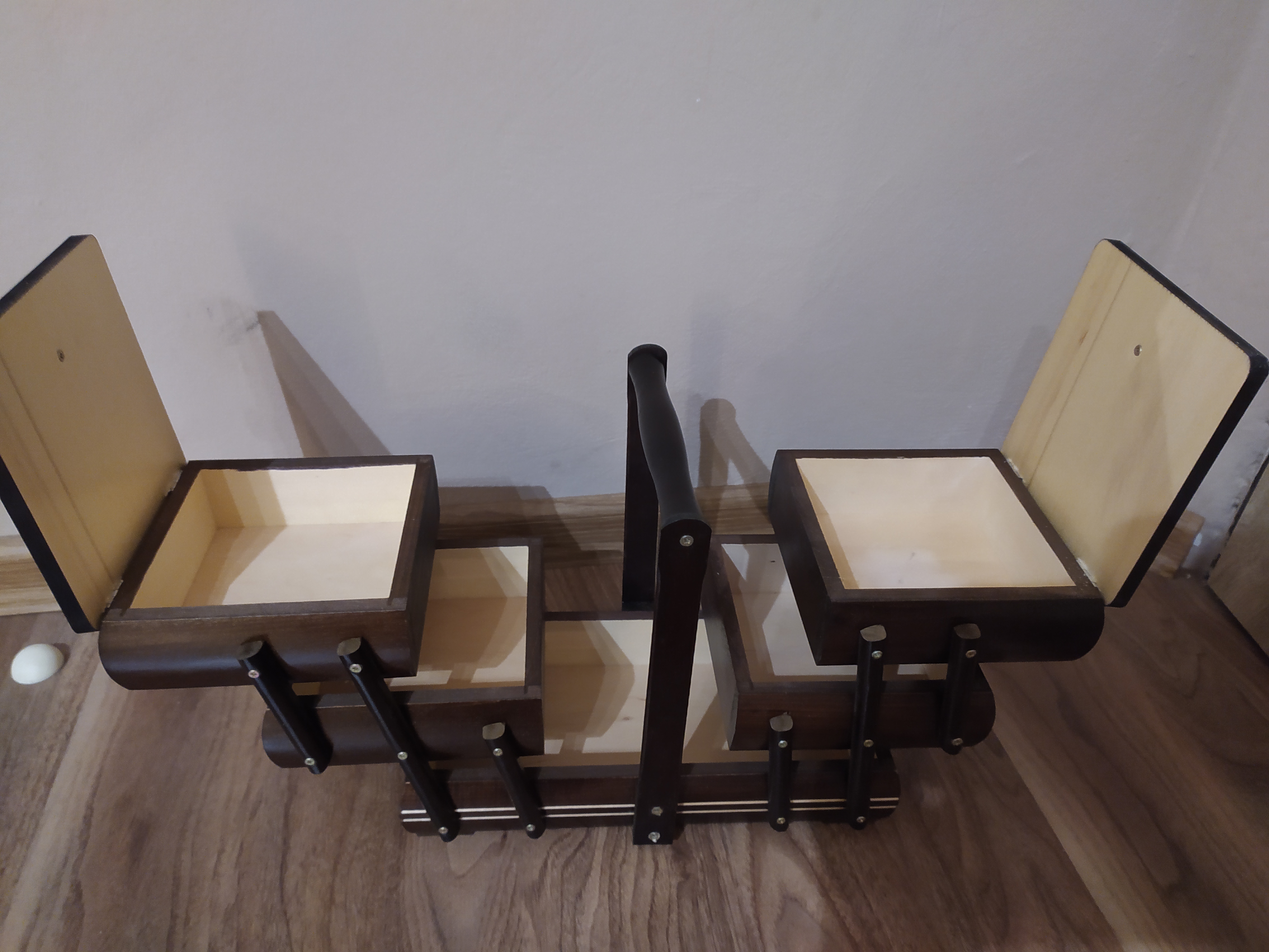 Dřevěná světlá rozkládací kazeta na šicí potřeby. Rozměry: š.30 cm, hl.15 cm, v.25 cm.
