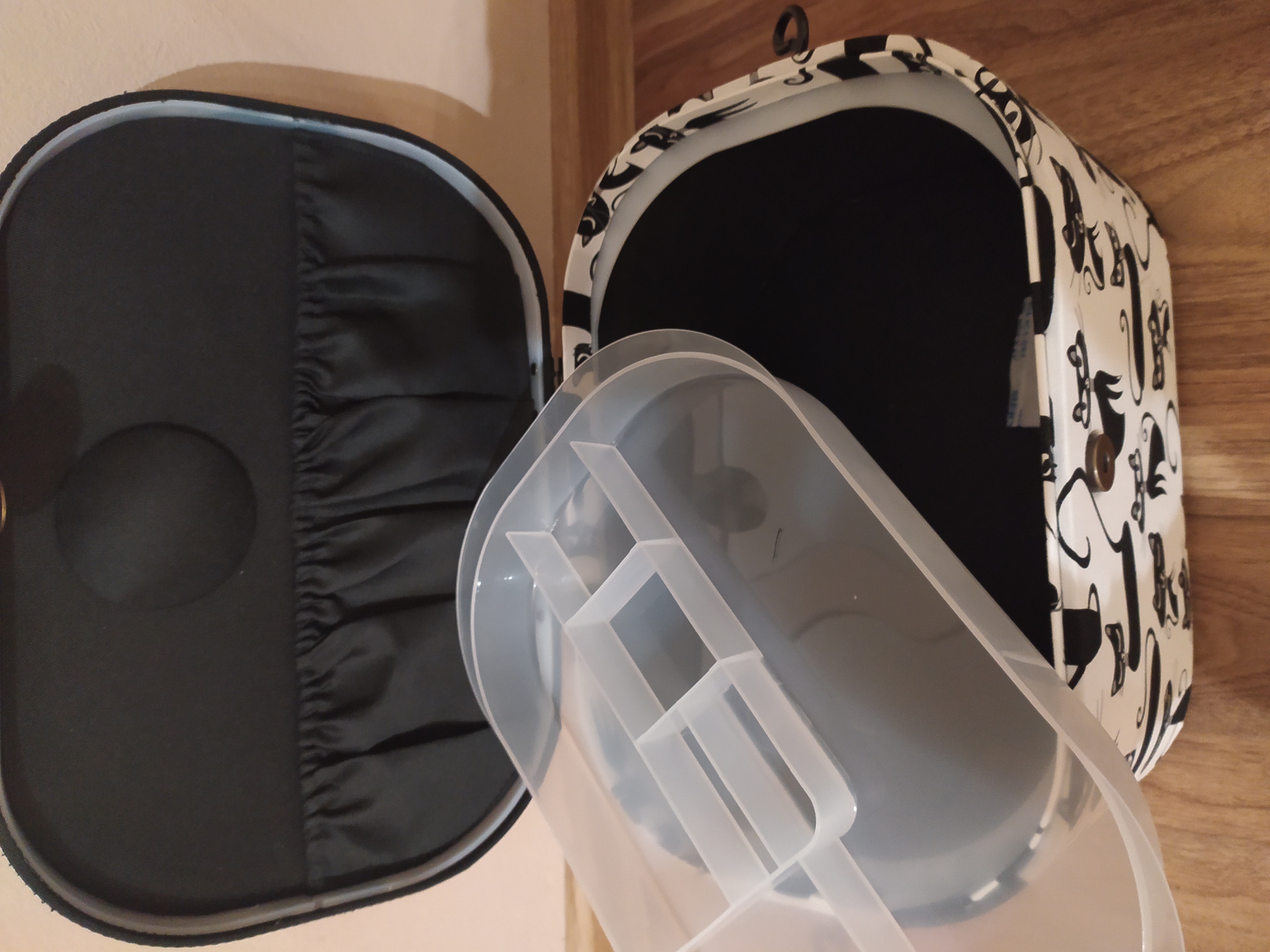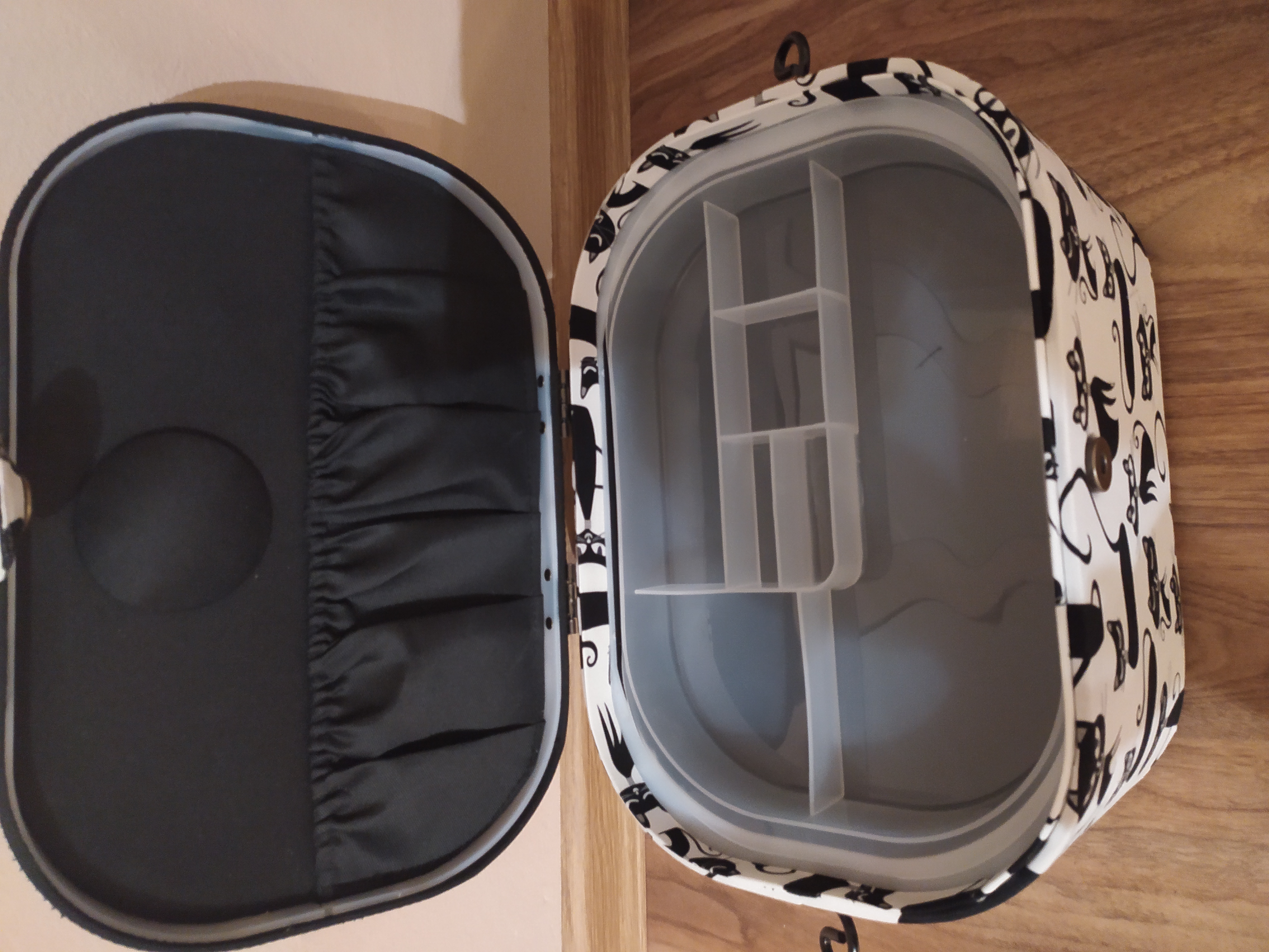 Větší oválná kazeta na skladování a transport šicích potřeb. Plastová vložka se 7 oddíly, madlo, praktické zapínání na magnet, jehelníček a 2 látkové kapsy na vnitřní straně víka. Rozměry 30,0x20,5x19,0 cm.