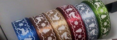 Saténová stuha s tiskem - sobi, šíře 25 mm, cena za metr. Doprodej.