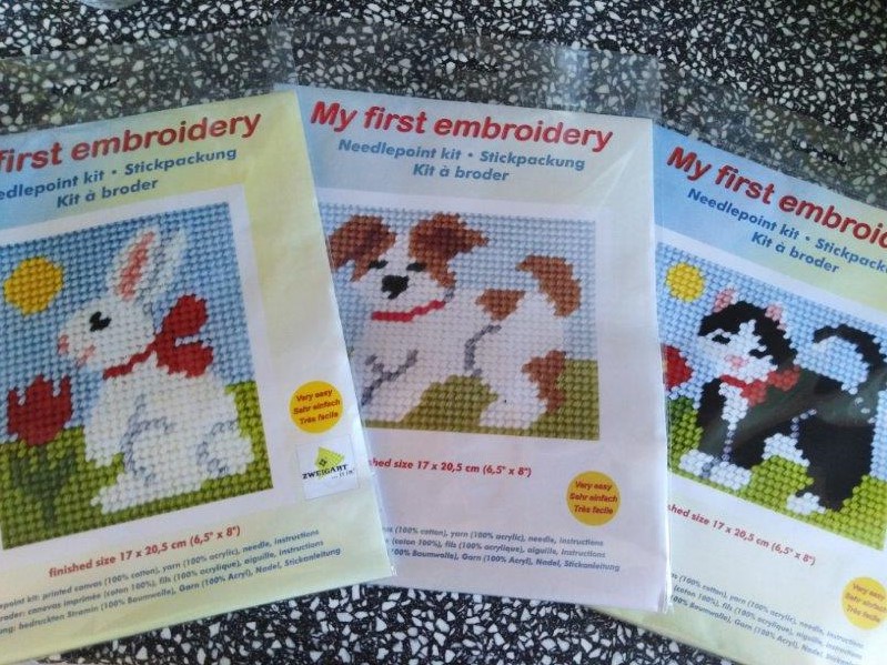 Sada vyšívací různé motivy, obsahuje předlohu 17x20,5 cm, vyšívací přízi (100% akryl), jehlu a návod. Cena za 1 ks.