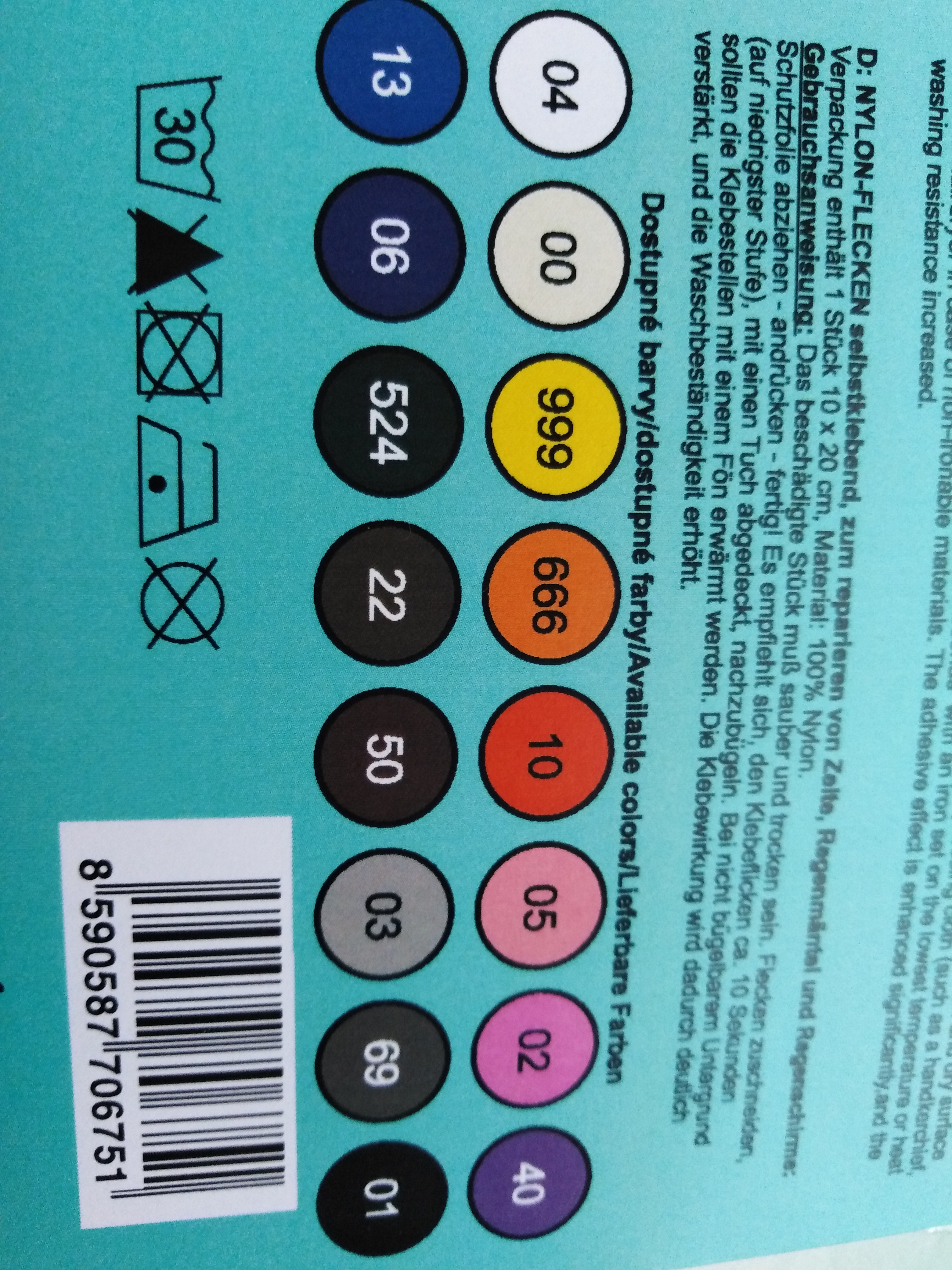 Samolepící nylonové záplaty o rozměru cca 12 x 20 cm, jeden kus na kartě.